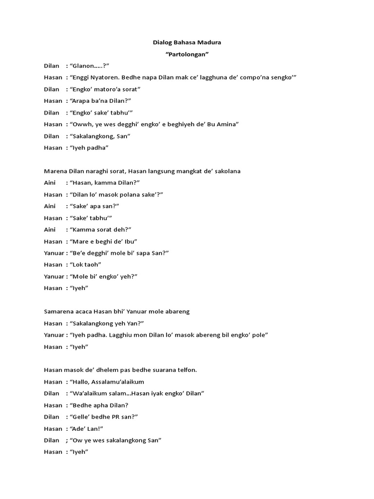 Dialog bahasa madura. Kandhâna Semmar bân Garèng 2. Hi this is a comment. Berbahasa Madura tidak mudah juga cara pengucapannya biasanya kalau orang luar Madura meskipun sudah lama di Madura.